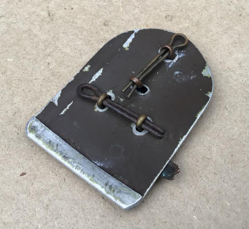 An interesting example of a fairly common badge as worn above SGT rank chevrons for Battery Sergeant but has a field made backing place made from Japanese aircraft aluminum. There is still the green pain on the reverse. A wonderful little gem!