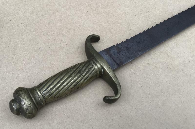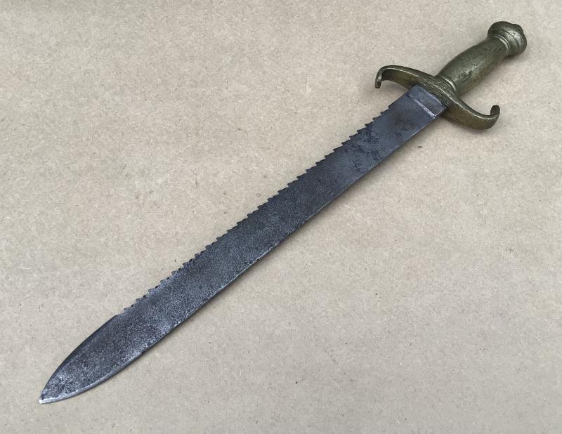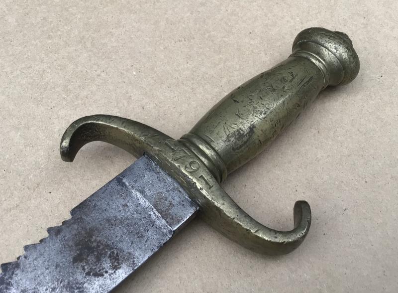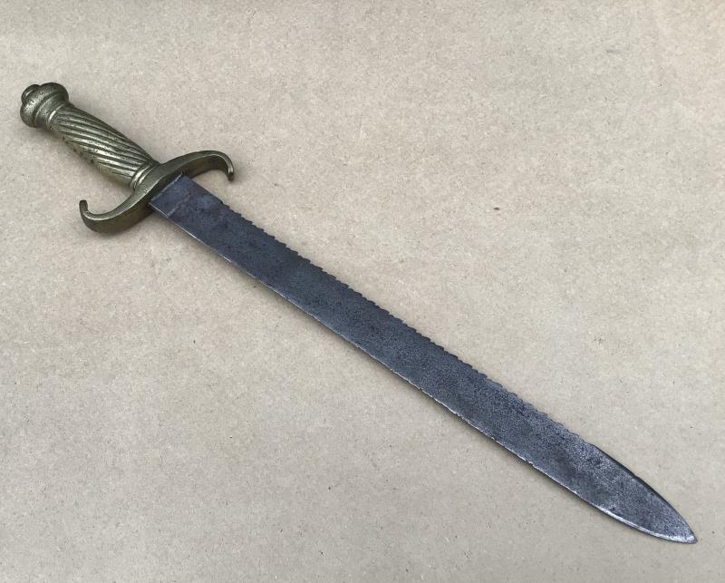 Brass hilt with sawback blade. No scabbard. Overall many dings and knocks to the brass hilt and some overall light corrosion to the blade.