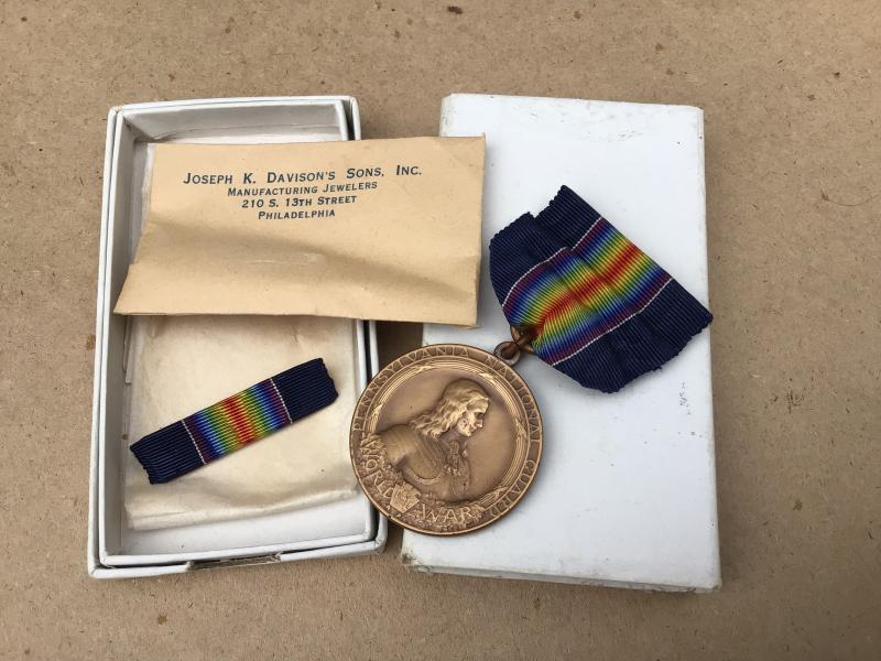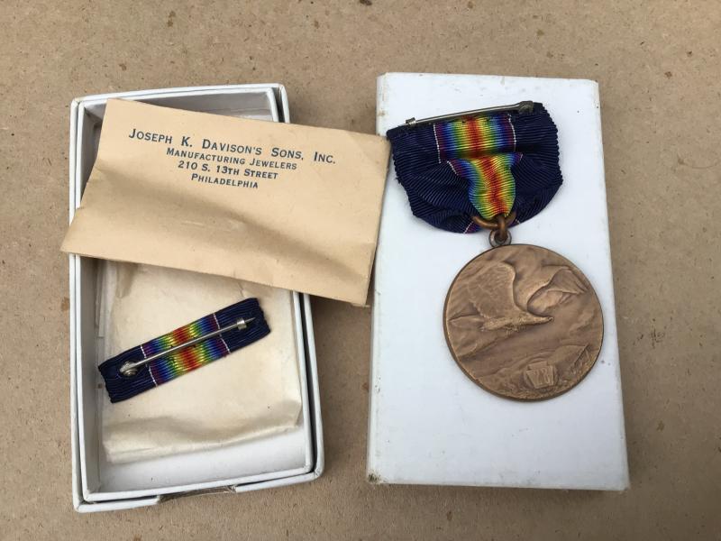 Original Pennsylvania State WWI Service full size Victory Medal 28th National Guard Division on original sewn in Mounted Pin Back Ribbon. Complete with matching ribbon bar and card box of issue.
