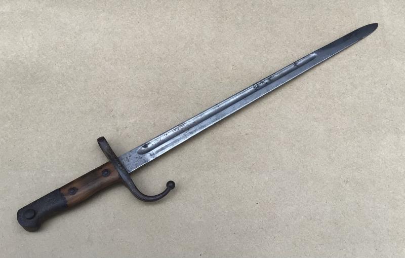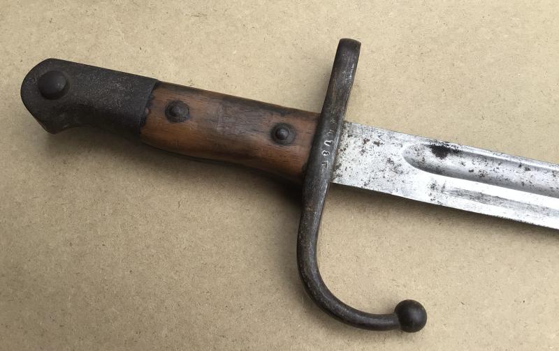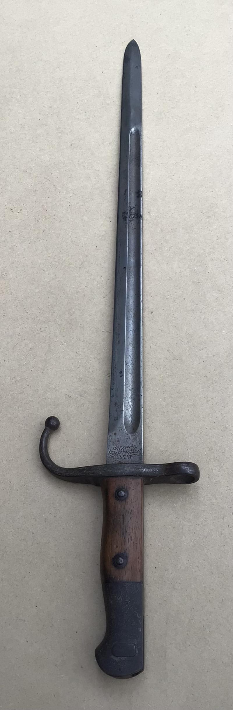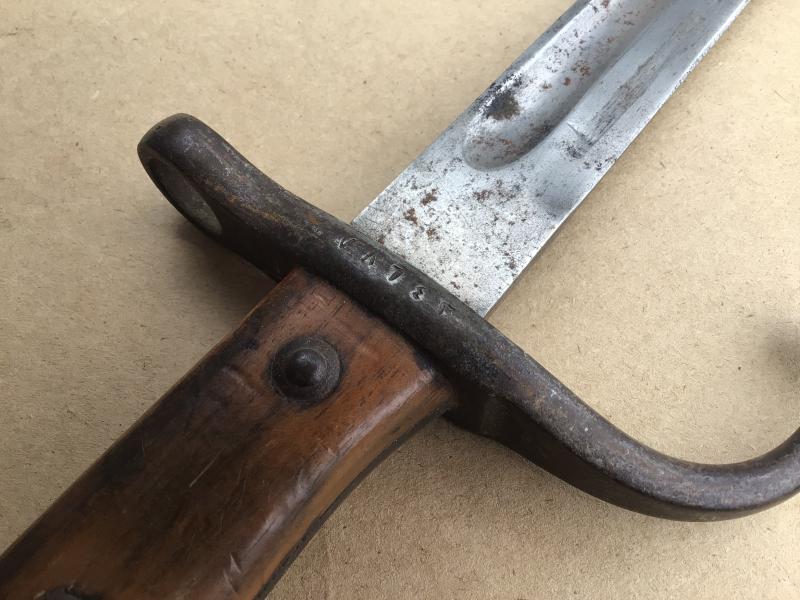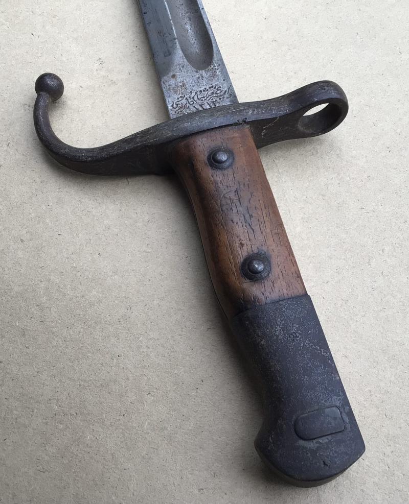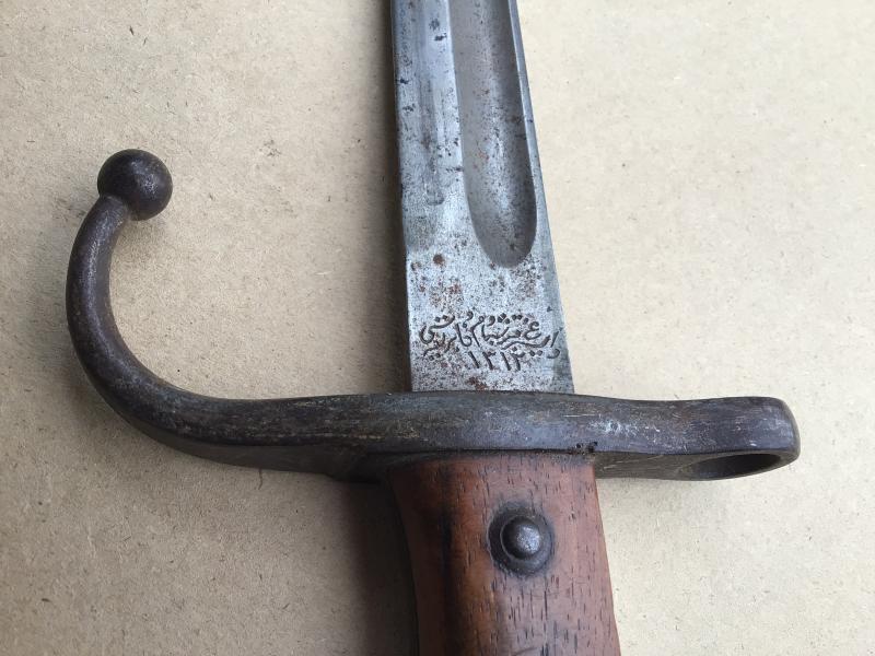 Model 1890 Turkish Mauser Bayonet. A good example of one of the many varied bayonets used by the Ottoman army during WW1. It has its original plain wooden grips held to the tang with two screw bolts. The cross guard is stamped in Turkish Arabic with a rack number. Has a good muzzle ring and a down-turned hooked quillion. The straight single edged blade has a single fuller to each side and the ricasso has the sultan s crest and arabic inscription over date stamp. Working locking stud. No scabbard.