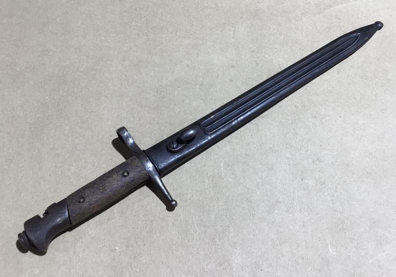 This bayonet is for use with the M1891 TS Carbine 2nd variant, which had a unique transverse bayonet lug requiring the bayonet to be placed over the muzzle, then slid sideways on to the bayonet lug from left to right. This arrangement required the bayonet's press stud to be at the rear of the pommel.
